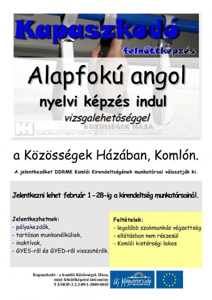 Alapfokú angol nyelvi képzés indul vizsgalehetőséggel tartós munkanélkülieknek a Közösségek Házában, Komlón.