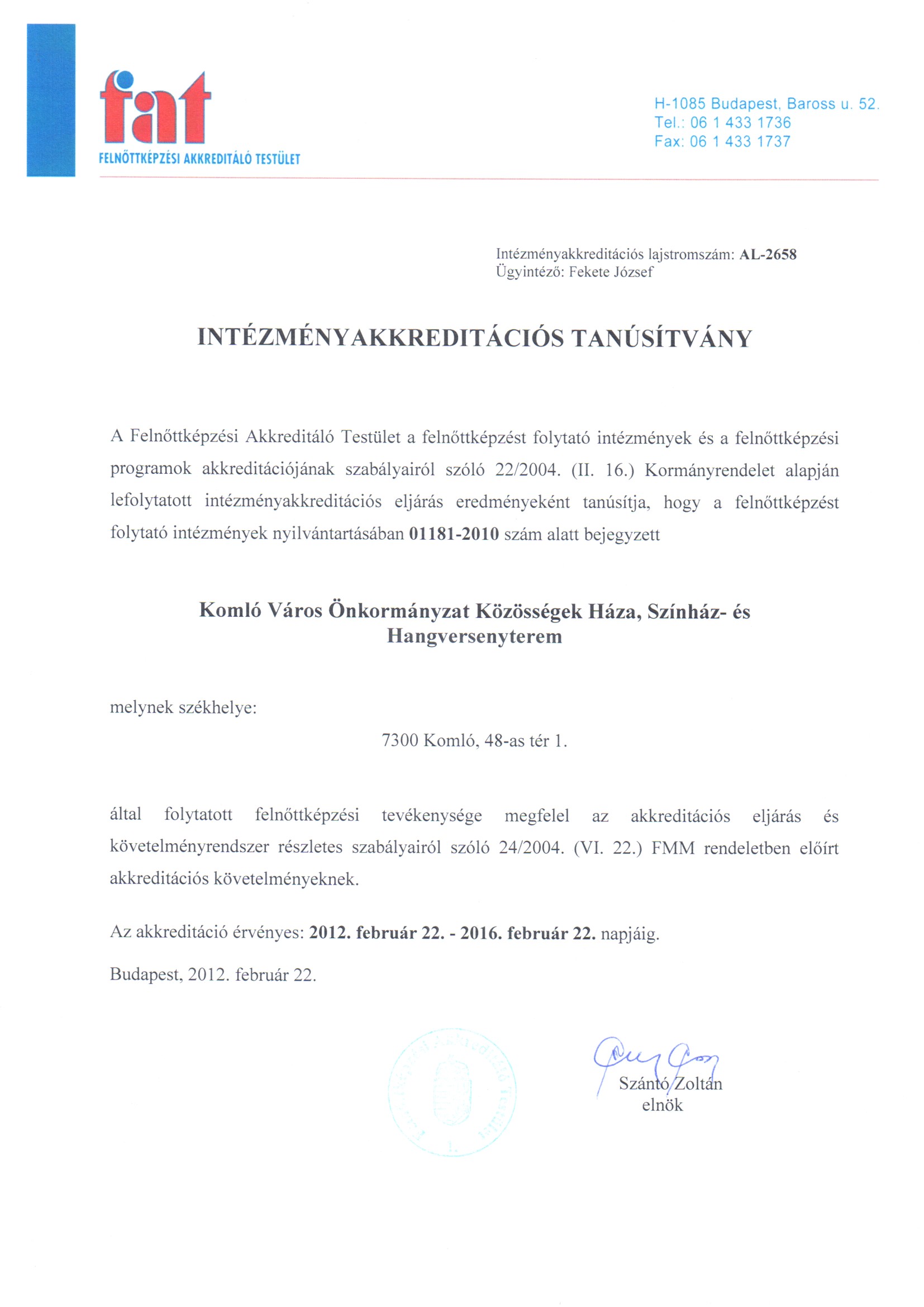 A Felnőttképzési Akkreditáló Testület 2012. február 22-én Komló Város Önkormányzat Közösségek Háza, Színház- és Hangversenyterem intézményét akkreditált felnőttképzési intézménynek nyilvánította.