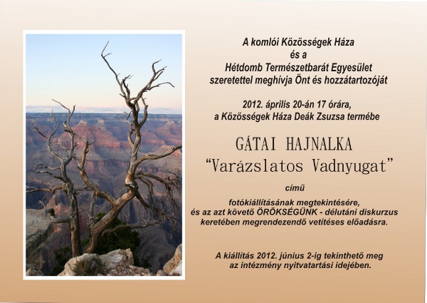 "Varázslatos vadnyugat" (Grand Canyon, Red Rock és Las Vegas) címmel nyílik, Gátai Hajnalka fotókiállítása 2012. április 20-án 17 órai kezdettel a Közösségek Háza folyosóján.
