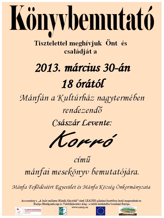 Sok szeretettel várunk mindenkit 2013. március 30-án 18 órától Mánfán a Kultúrház nagytermében rendezendő Császár Levente: KORRÓ című mánfai mesekönyv bemutatójára és annak kiállítására.