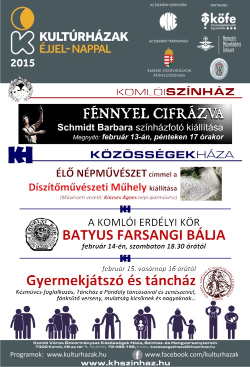 A 2015. évi Kultúrházak éjjel-nappal akció meghirdetője és lebonyolítója a Magyar Népművelők Egyesülete. Partnerünk a Közösségfejlesztők Egyesülete és a Kulturális Központok Országos Szövetsége, továbbá a Nemzeti Művelődési Intézet, támogató az Emberi Erőforrások Minisztériuma. Az esemény fővédnöke Balog Zoltán, az emberi erőforrások minisztere.