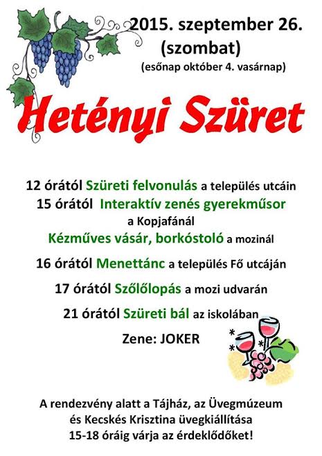 Szüreti felvonulás, interaktív zenés gyermekműsor, kézműves vásár, bórkostoló és még sok más színes program várja az érdeklődőket!