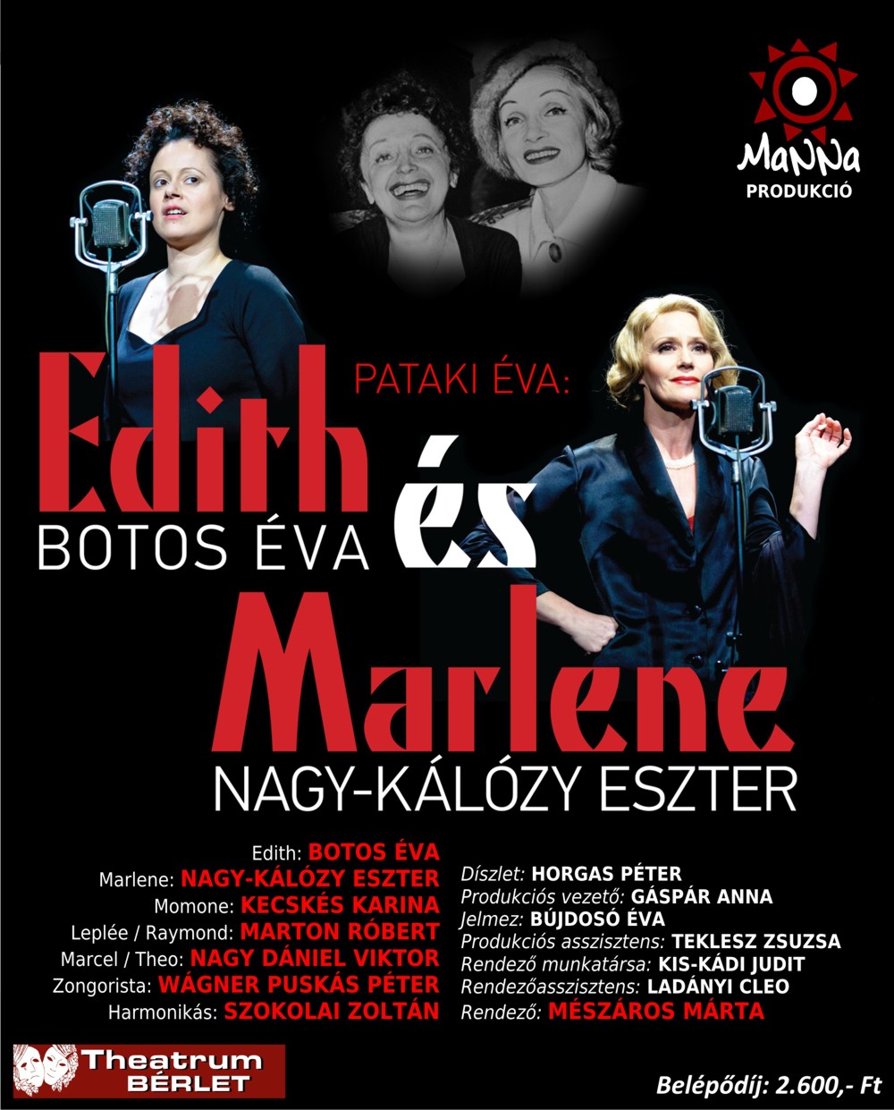 A darab a prágai, a pozsonyi és a varsói bemutatók után ismét „hazatér”. Edith Piaf és Marlene Dietrich életét, barátságát tárja elénk. Mészáros Márta rendezésében az előadás a Nőről, a nőiességről és a két zseniális énekes-színész mellett Botos Éváról ésNagy-Kálózy Eszterről fog szólni.